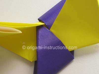 Origami Ninja Star Step 17: We will now fold the yellow tips over and fit them under the purple flap. It will be a snug fit!